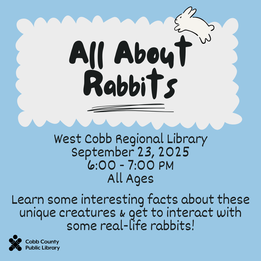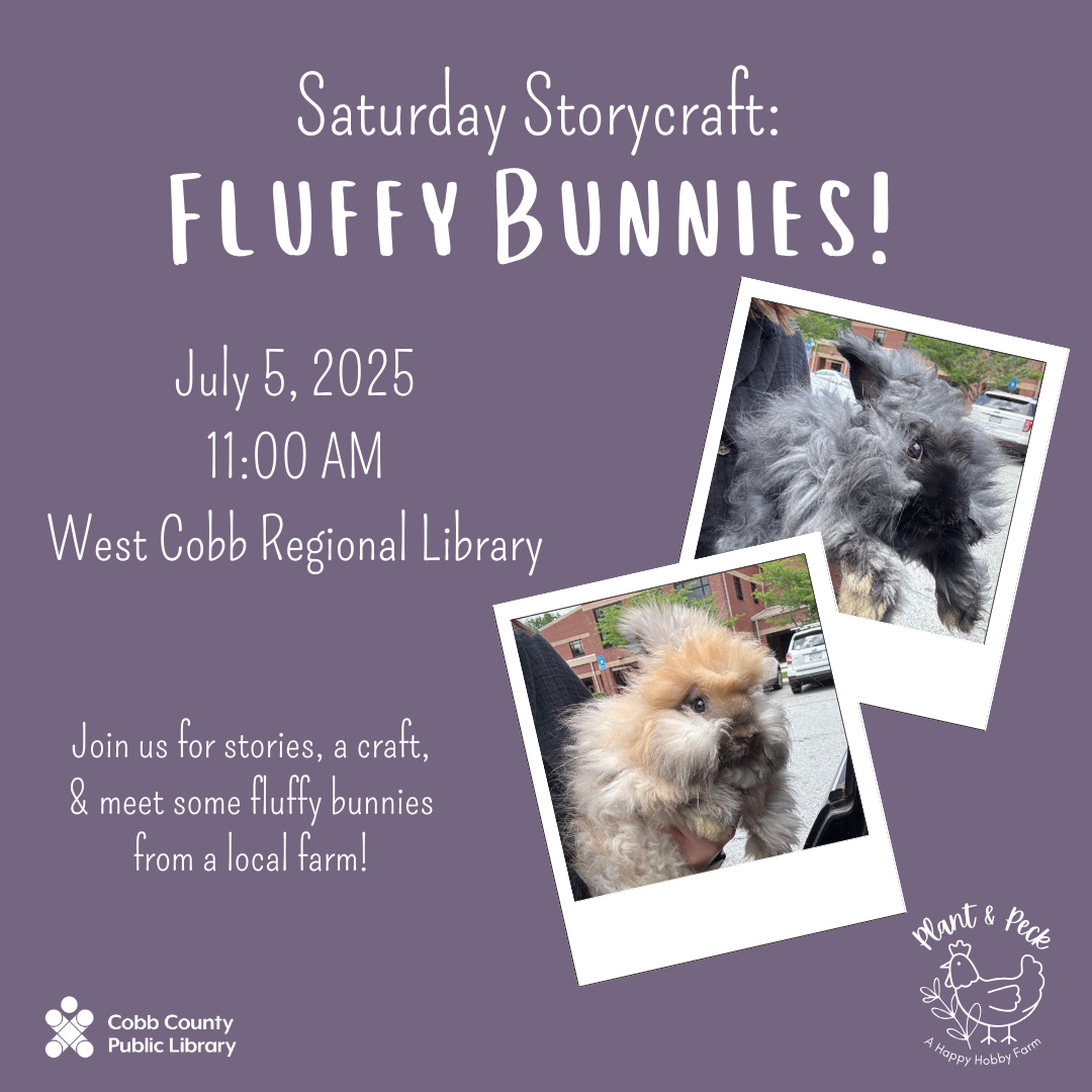 Join us at the West Cobb Regional Library to learn some interesting facts about these unique creatures! We will talk about some basic biology, fun trivia, and go more in-depth on the Angora breed of rabbits. Participants will get to meet and interact with several of our English Angora rabbits after the short presentation.