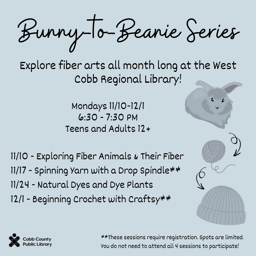Join us at the West Cobb Regional Library for a month-long fiber arts workshop series! We will discuss fiber animals and their fiber, how to use a drop spindle, natural dyeing, and a beginning crochet lesson. Registration is required for some events and can be found at cobbcat.org.