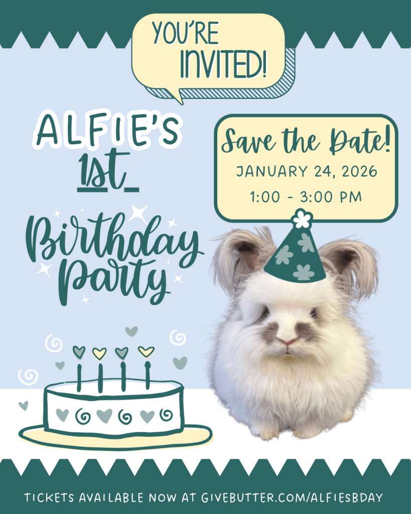 Alfa-bun is turning one! Celebrate Alfie’s birthday with us as part of a fundraiser for our Bunny Barn and non-profit efforts. Admission is $10 per family (up to 4) and includes a cupcake and a bunny-themed craft. We’ll also have lawn games, a photo booth, and of course, bunnies!