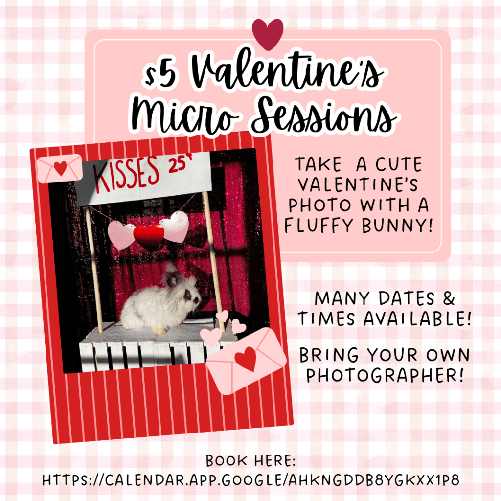 Please bring your own photographer! Sessions are for 15 minutes with our bunny kissing booth. Lettuce will be provided for you to feed the bunnies during or after your photos.